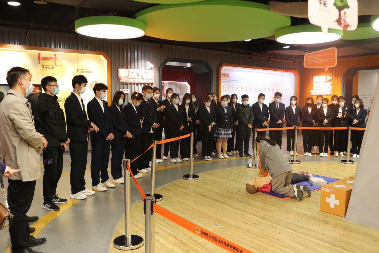 活动中,国防动员办公室派工作人员带领大家参观展馆,结合战争空袭和公共安全素材,开展急救培训、趣味答题、高铁逃生等项目,拓展大家的视野,增强大家的国防与安全意识。