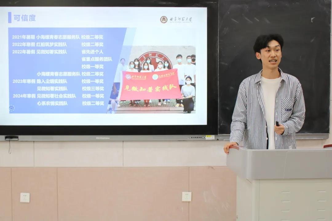 交流分享话经验,学思践悟踏新程。本次会议邀请2020级地科二班侯登登、2021级地科一班付丰赫进行社会实践活动经验分享、社会实践视频拍摄及剪辑经验分享,帮助同学们进一步理解社会实践,汲取社会实践的经验。侯登登深入剖析往期社会实践队伍的选人、选题、答辩、投稿审稿上的问题,依据个人社会实践获奖成功经验,给出相应改进提升方案,并鼓励同学们从学校课堂走向社区社会,为社会发展贡献自己一份力量。付丰赫依次从视频拍摄工具、拍摄人物主体、剪辑技巧等方面分享技巧和经验,使同学们收益颇丰,有所启发。