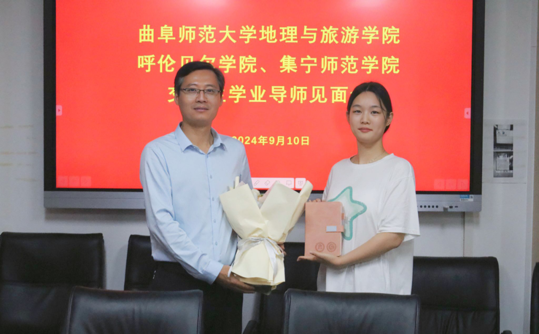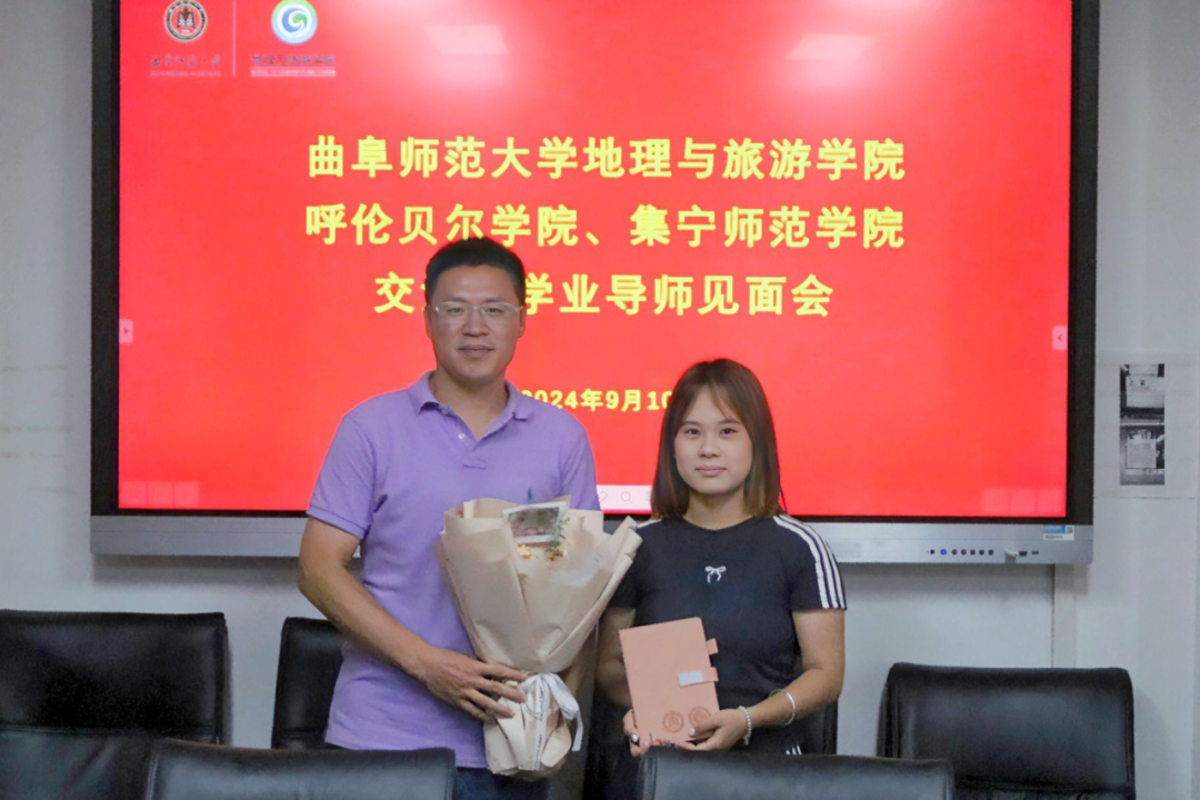 的张皓雪、胡锦秀三位交流学生依次进行了自我介绍并为自己的学业导师献上了鲜花,表达对老师们的敬意与感恩之情。三位导师回赠学习用品,并深情赠言寄语。老师们表示,诚挚欢迎三位学生的到来,一定会尽心尽力为同学们提供学习和交流的平台,希望他们在曲阜师范大学生活愉快、学习进步,学业有成。