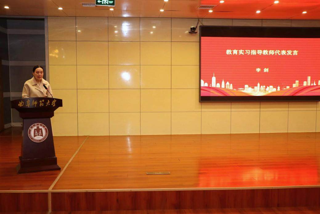 随后,李剑老师代表指导教师发言。她提出教育实习是师范生培养的重要环节,是理论与实践结合的最好平台。纸上得来终觉浅,绝知此事要躬行,希望同学们把握好机会,在实践中学习和巩固理论知识,在教育实习中积累教学和社会经验,努力提升自身的专业素养和教学能力。同时,她希望同学们牢记学高为师、身正为范的师训,服从女足直播
