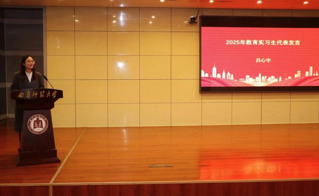 2022级地理科学师范生吕心宇作为教育实习生代表发言。她代表全体实习生郑重承诺,严格遵守教育实习相关规定,尽力所为,高质量完成教育教学实习任务,提高教育水平和教学技能,为学校女足直播