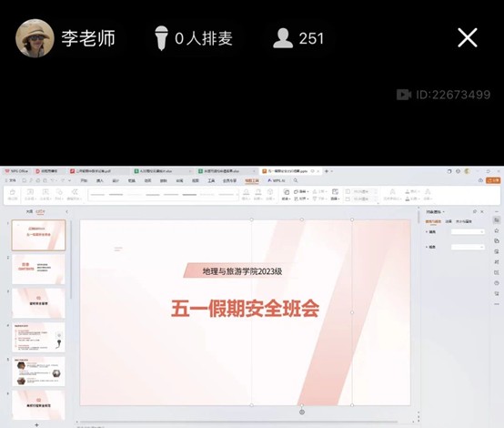 于线上召开2023级五一假期安全班会。本次会议由2023级辅导员李梅主讲,2023级全体学生参加。