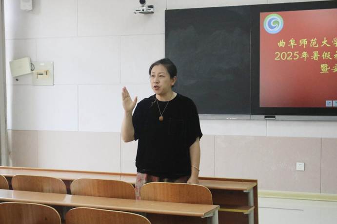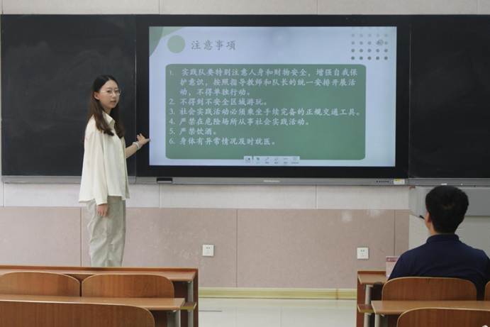 社会实践部成员于珂瑶详细讲解暑期社会实践安全注意事项与总则。她具体介绍社会实践团队的成员组成及具体职责,强调安全是一切活动的根基,要求全体成员严格遵守纪律,确保实践活动有序开展。