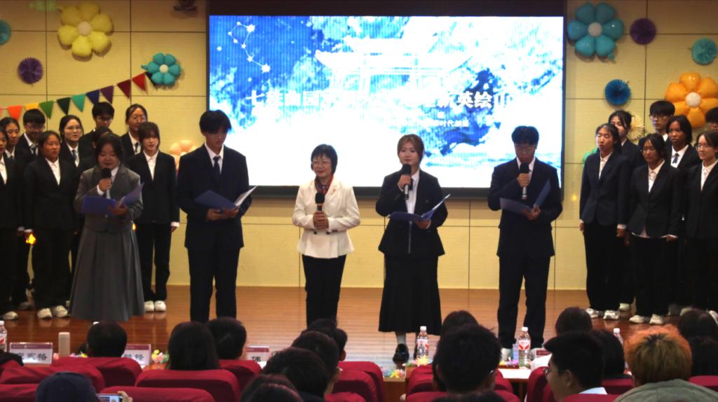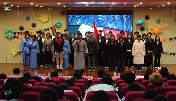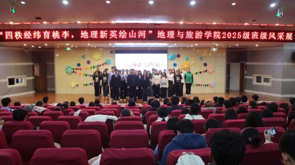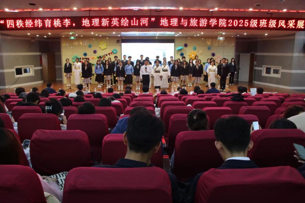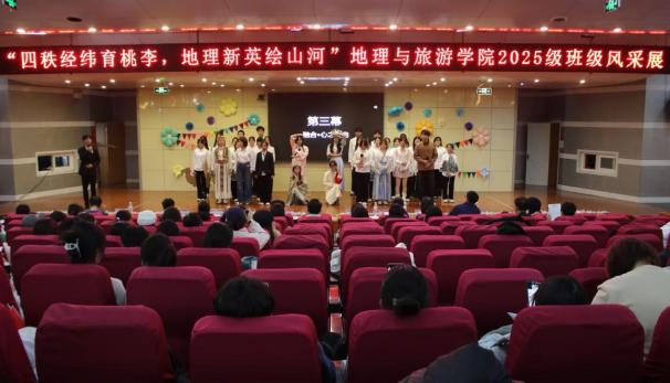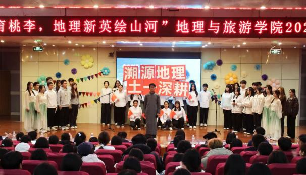 发展与青春梦想,演绎地理人与山海的深情奔赴;地科五班的《探山河,咏祖国》以话剧形式带领观众重走先辈勘探足迹,一曲《我爱你中国》唱响新时代地理人的爱国热忱;旅管二班邀请艾小飞老师一起呈现《新生“防骗”修炼手册》情景剧,为同学们科普反诈知识,传递安全防护智慧;土管一班的《七秩田园薪火盛,地理新英山河行》融合话剧与合唱,展现了地理从传统地图到数字建模的发展历程,诠释专业传承;土管二班的《霞客行》致敬地理学家徐霞客,重现科考精神;旅管一班的《山河的回响》中,张瑜老师与同学们共同呈现自然与人文的共生;地科二班的《我与地院》里,刘飞老师携手学子,借幕布话剧讲述大家与女足直播
