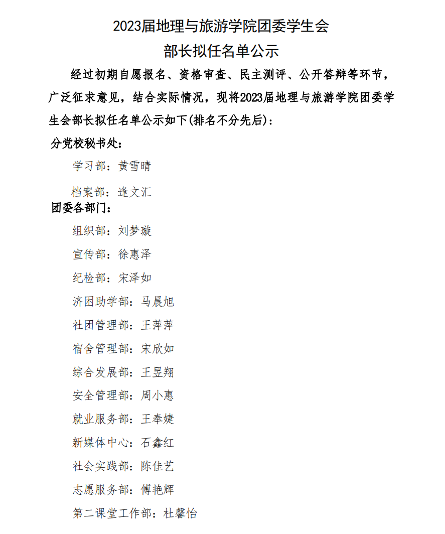2023届澳洲女足直播 团委学生会部长拟任名单公示