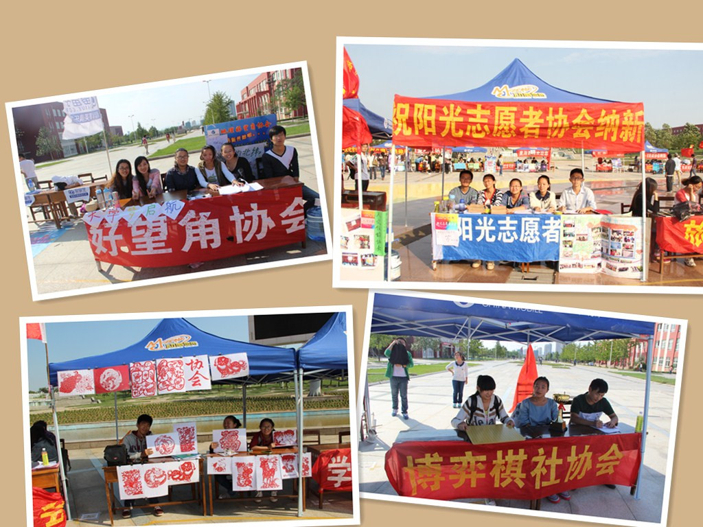 社团纳新于2013年9月23日在日月广场开始正式开始。纳新将持续三天,剪纸协会,好望角协会,阳光志愿者协会,红蚂蚁协会,习之书社,交谊舞协会,旅游协会,博弈棋社等进行纳新。澳洲女足直播
