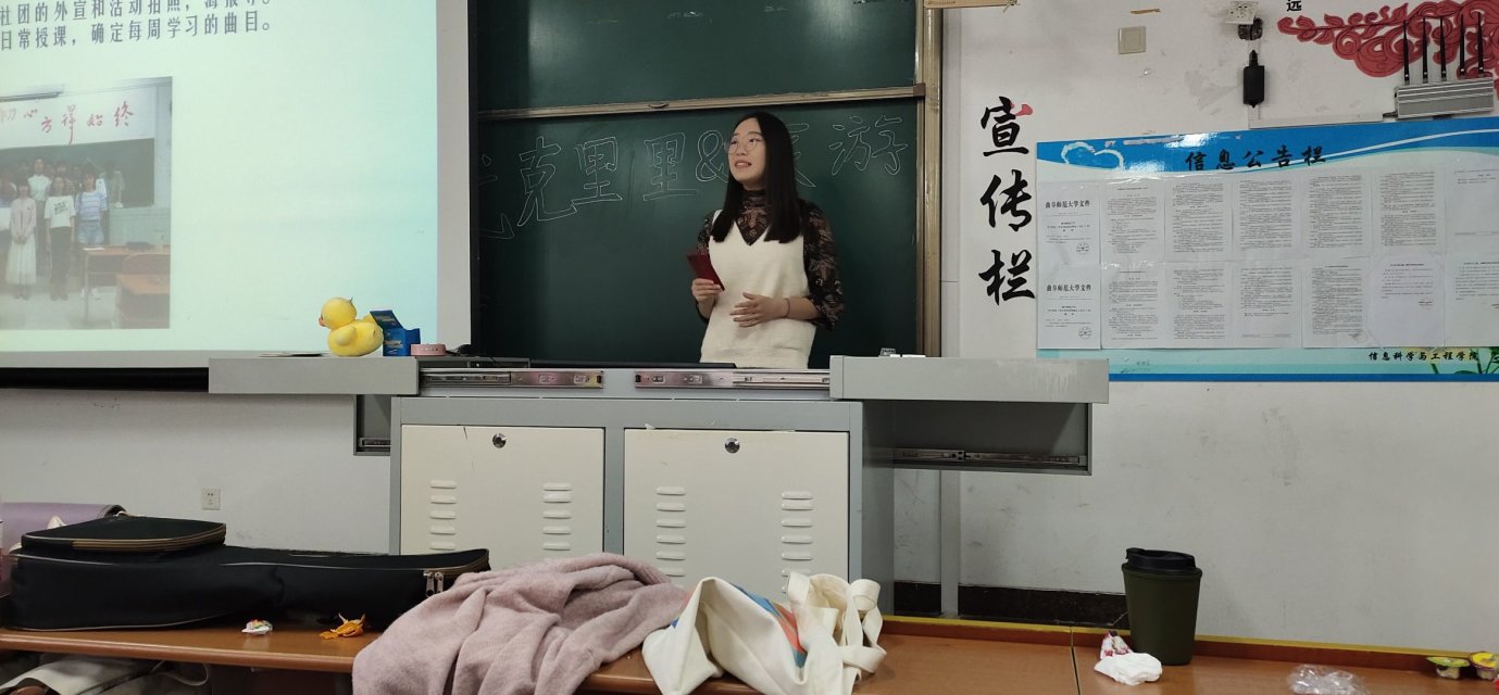 在技术部部长唐健的尤克里里指弹表演中,见面会正式开始。各协会主要负责人对本协会进行相关介绍,就部门分工、负责范围等方面介绍日常工作要求。随后,伴随着技术部部长王茂霞的歌曲演唱,游戏环节开始。同学们激情满满,热情参与,依次进行了听歌识曲,击鼓传花等游戏,其中穿插着表演活动。唐健表演的《盗将行》指弹、李宁带来的《卡农》指弹、王茂霞演唱的歌曲《后来》将见面会的气氛推到高潮。游戏过后,各会长分别就社团问题发表讲话,主持人做总结发言,至此此次见面会圆满结束。