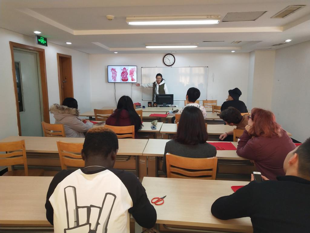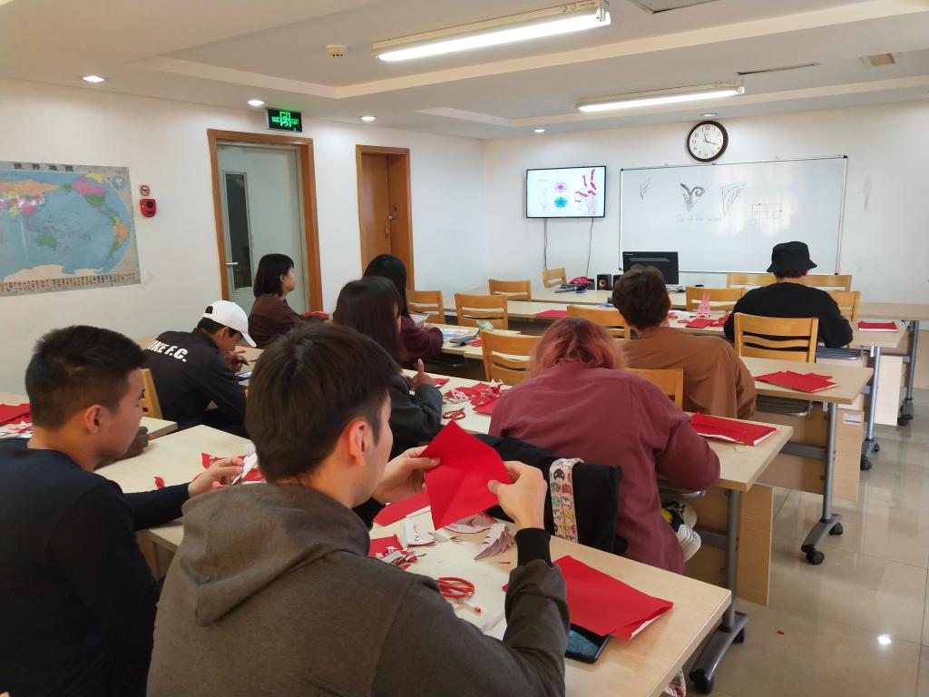 活动开始,李明羽向耐心细致地向留学生讲解剪纸文化由来,教授剪刀的握法及剪法,她还向大家展示方块、月牙等剪纸基本图形,并教授留学生同学运用基本图形拼凑剪出一幅作品。最后,她教大家用四折法、五折法剪出团花,并展示部分精美成品,大家将剪刀和剪纸灵活运用,剪出了一幅幅优秀的作品。