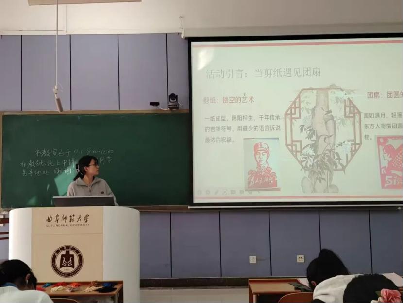 活动伊始,社团教学部部长郭宇婷结合图文课件,生动讲解了剪纸扇从古代文人雅士的随身雅物,到现代民俗手作的深厚文化渊源;同时细致演示了图样裁剪、扇面粘贴、流苏装配的关键步骤,尤其强调了剪纸边缘对齐、胶水均匀涂抹等实操技巧。