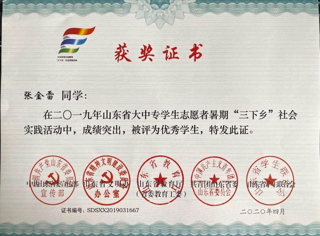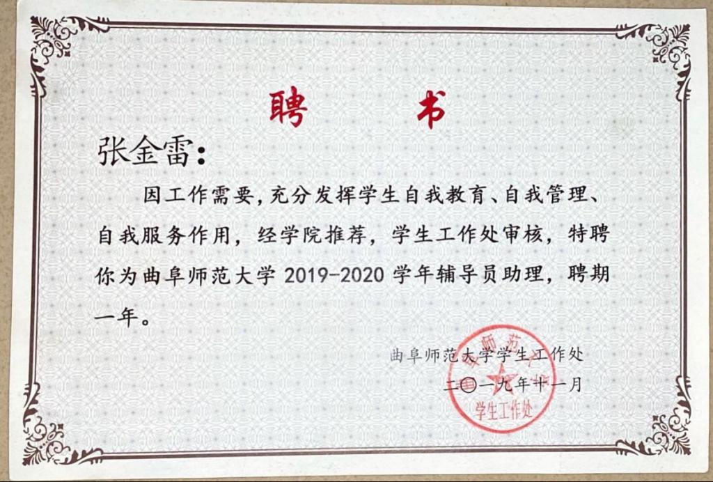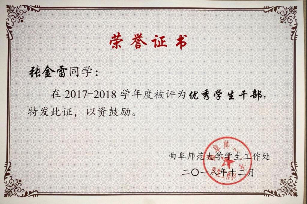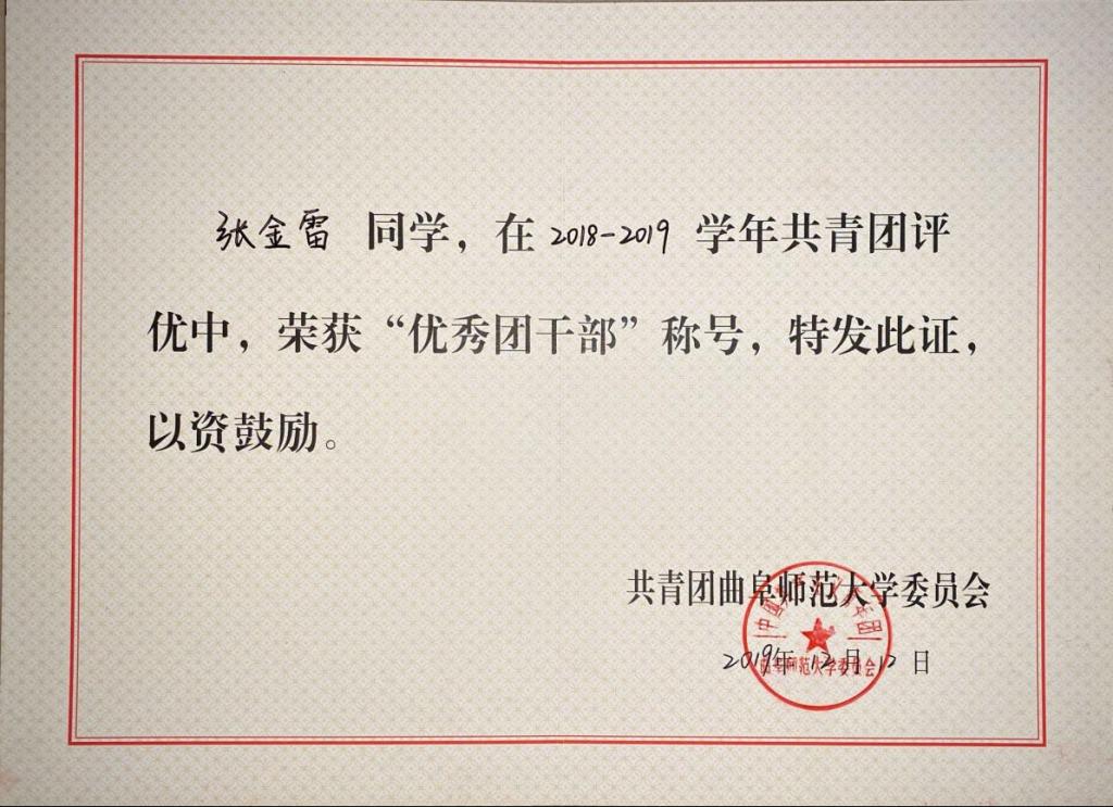2019届团委学生会主席,曲阜师范大学2019-2020学年辅导员助理。曾获2019 年全省大中专学生志愿者暑期“三下乡” 社会实践活动优秀学生,曲阜师范大学“优秀毕业生”、“优秀学生干部”、“优秀团干部”、二等奖学金、曲阜师范大学暑期“镜头中的三下乡”社会实践先进个人和“优秀工作者”等荣誉。