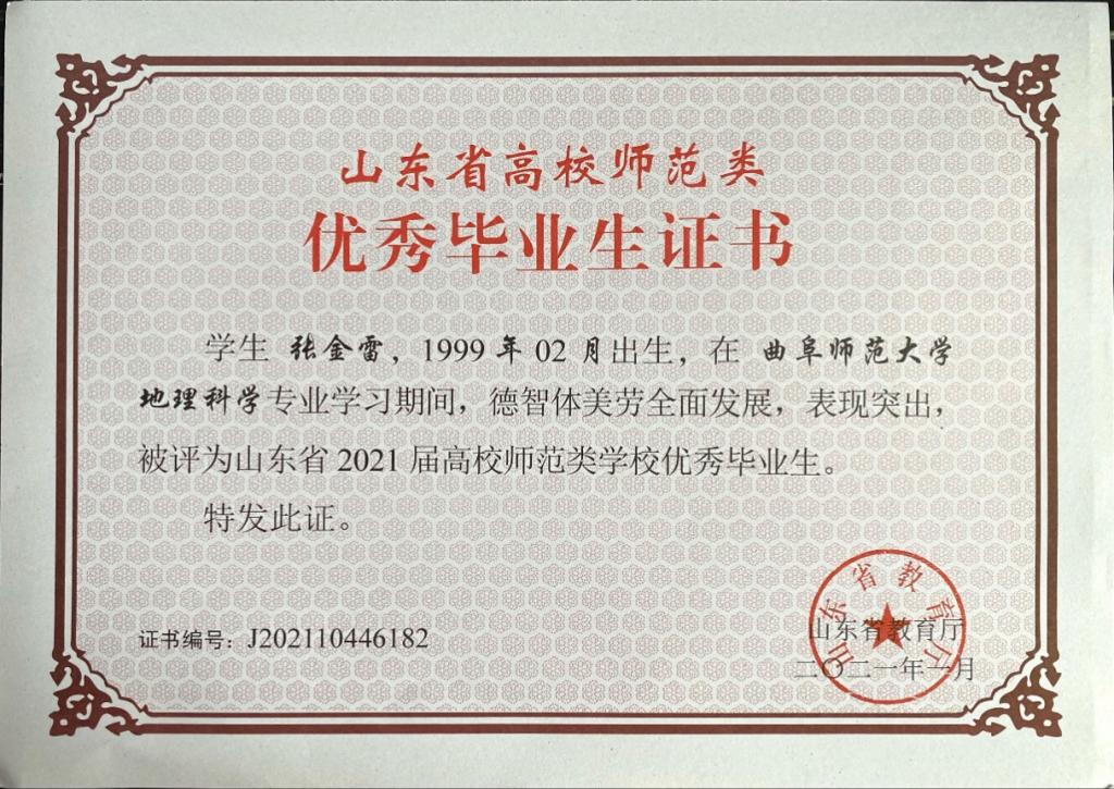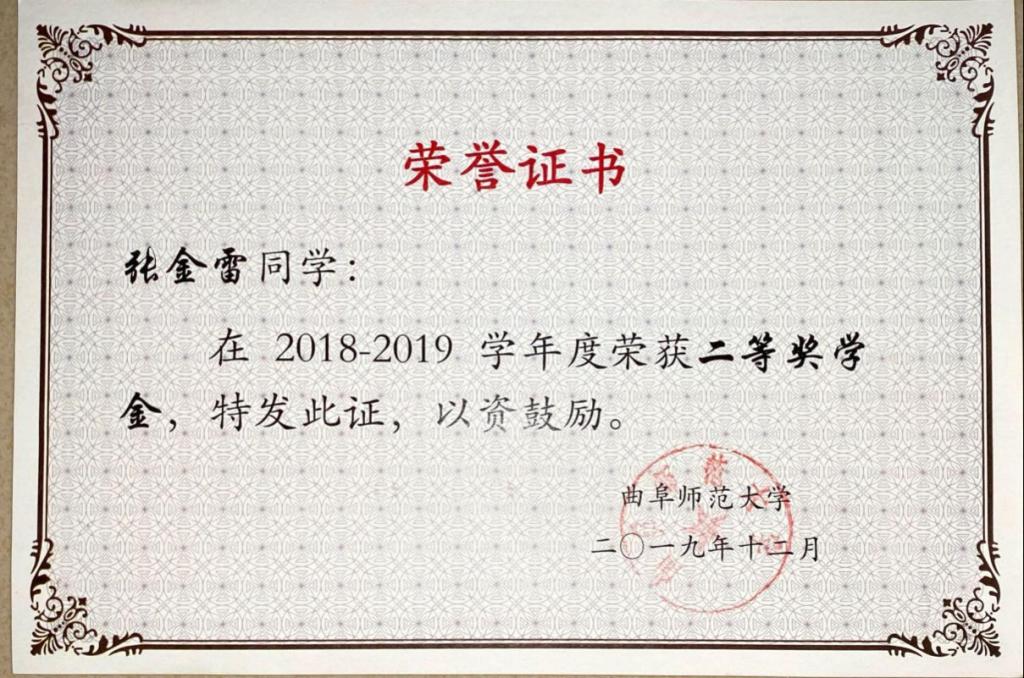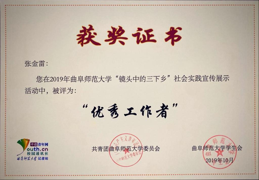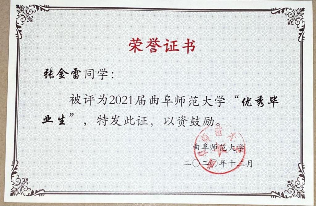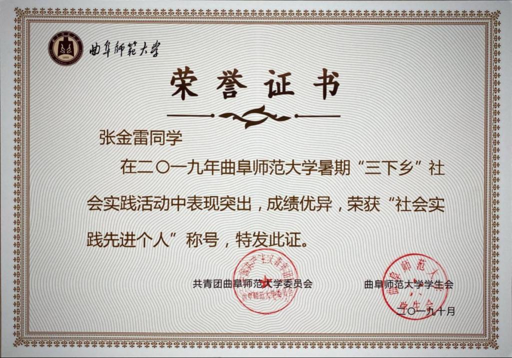 2019届团委学生会主席,曲阜师范大学2019-2020学年辅导员助理。曾获2019 年全省大中专学生志愿者暑期“三下乡” 社会实践活动优秀学生,曲阜师范大学“优秀毕业生”、“优秀学生干部”、“优秀团干部”、二等奖学金、曲阜师范大学暑期“镜头中的三下乡”社会实践先进个人和“优秀工作者”等荣誉。