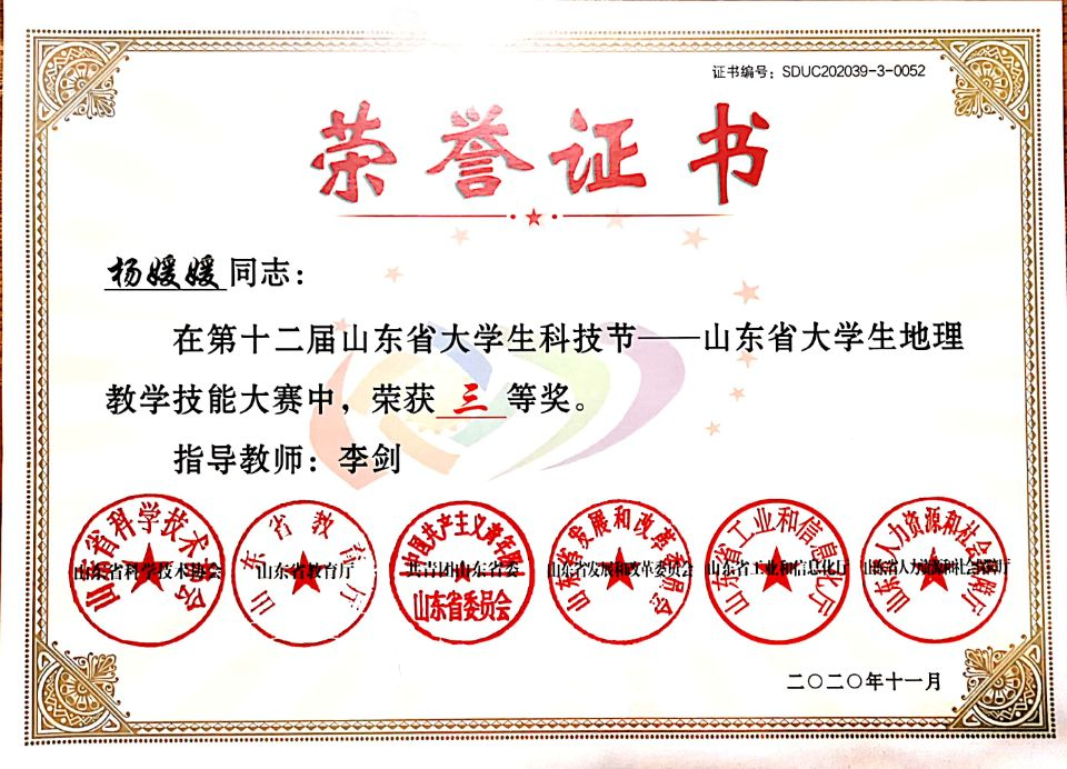 在专业技能方面,第八届山东省师范类高校学生从业技能大赛一等奖,十二届山东省大学生科技节地理教学大赛三等奖,曲阜师范大学第九届本科师范生教学技能大赛一等奖,澳洲女足直播