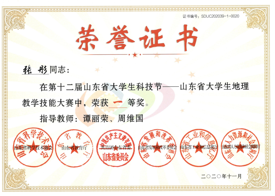 获奖情况:2020年山东省大学生地理教学技能大赛一等奖