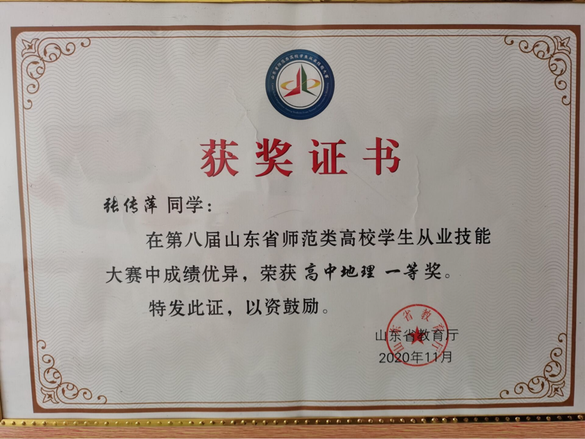 获奖情况:第八届山东省师范类高校学生从业技能大赛中高中地理一等奖。