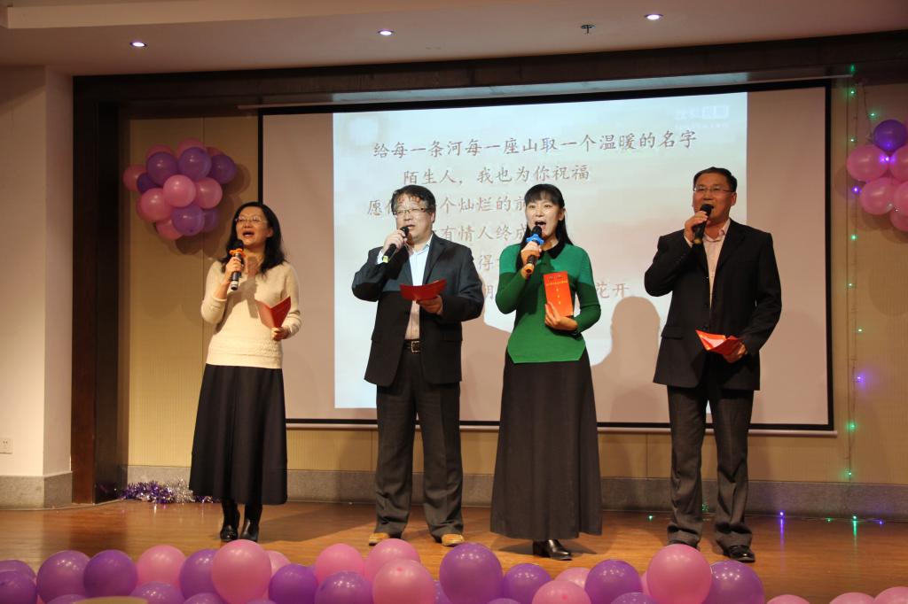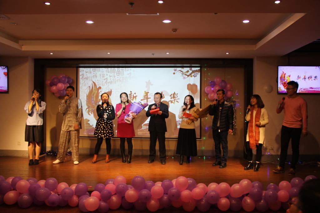 晚会共有包括唱歌、舞蹈、小品、相声、诗歌朗诵等不同类别的14个节目,精彩纷呈,各具特色,为大家呈现了一场精彩的视觉盛宴。其中,歌曲串烧《懵懂青春》引爆了全场第一个高潮;相声《文武双全》,逗得大家捧腹大笑,将晚会的气氛推向高潮;古筝茶艺《渔舟唱晚》,古筝声随指续,宛转悠扬,茶艺优雅淡然,韵味十足让全场观众享受了一场视听盛宴;诗朗诵《我们这一年》喜感十足,嗨翻全场。晚会中院领导、老师们也纷纷登台,参与到节目中来与师生共享新年祝福。胡书记带领院系老师的诗朗诵《面朝大海,春暖花开》,在或舒缓或激昂的朗诵中为同学们中展现了一幅优美画卷,引发了观众们的无限深思;荆延德老师的陈氏太极拳表演既充满着古典韵味,又彰显了中华传统文化独特的魅力;晚会中胡书记,代院长,王院长还分别参加了一轮互动游戏,在游戏中将浓浓师生情表现的淋漓尽致,看的同学们都跃跃欲试,全场气氛热烈,掌声不断;节目最后,代院长和老师们与研究生同学以一曲《相亲相爱的一家人》为大家送上了新年祝福,引得掌声与欢呼声连连,台上台下瞬间成了一片欢乐的海洋,晚会在合唱声中完美落幕。