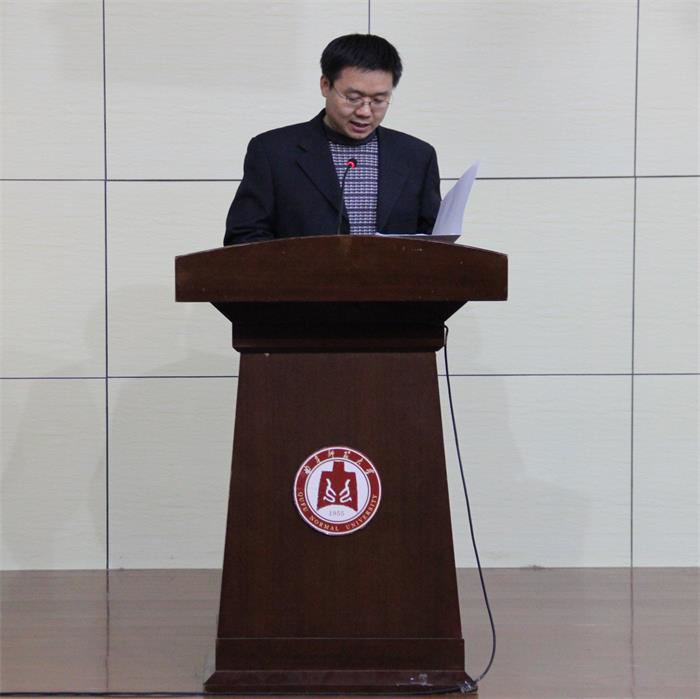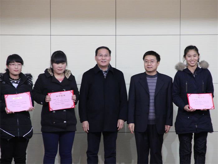 党总支副书记杨兴防致推荐词后,2012级专业第一名学生张琳林,卞慎芳和纪娜同学依次登上主席台,发表获奖感言,党总支书记胡长春为她们颁发明星学子荣誉证书,并合影留念。
