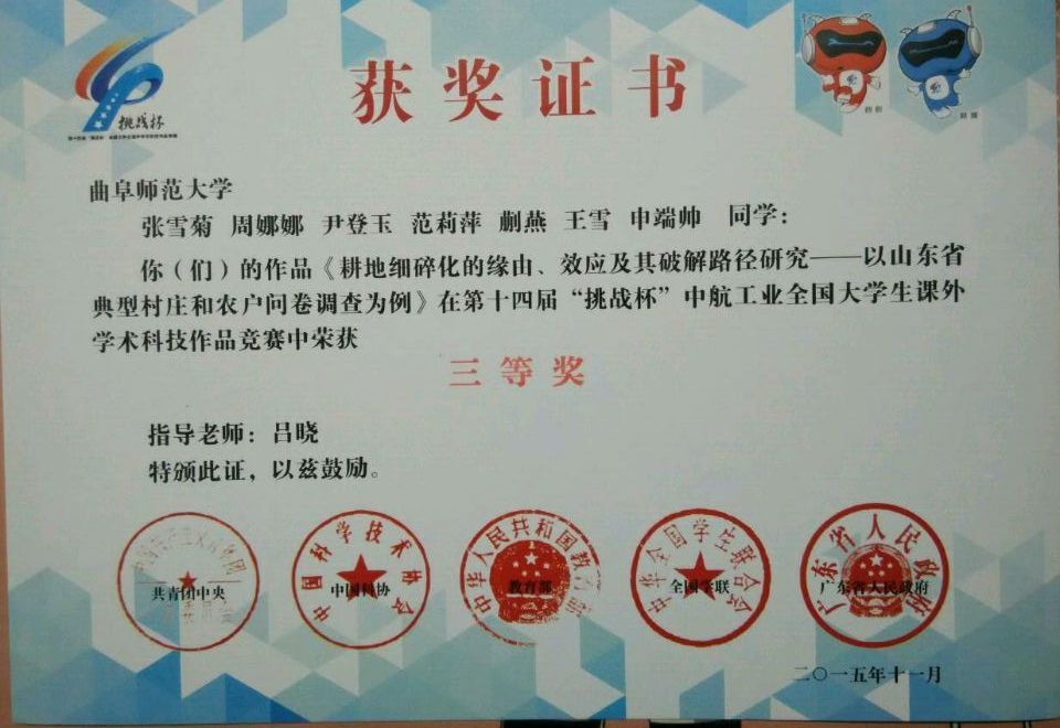 11月20日,第十四届“挑战杯”全国大学生课外学术科技作品竞赛决赛在广东工业大学落下帷幕,澳洲女足直播 选送的由吕晓老师指导、张雪菊、周娜娜、尹登玉、范莉萍、蒯燕、王雪、申端帅参与完成的经济类作品《耕地细碎化的缘由、效应及其破解路径研究——以山东省典型村庄和农户问卷调查为例》荣获三等奖。
