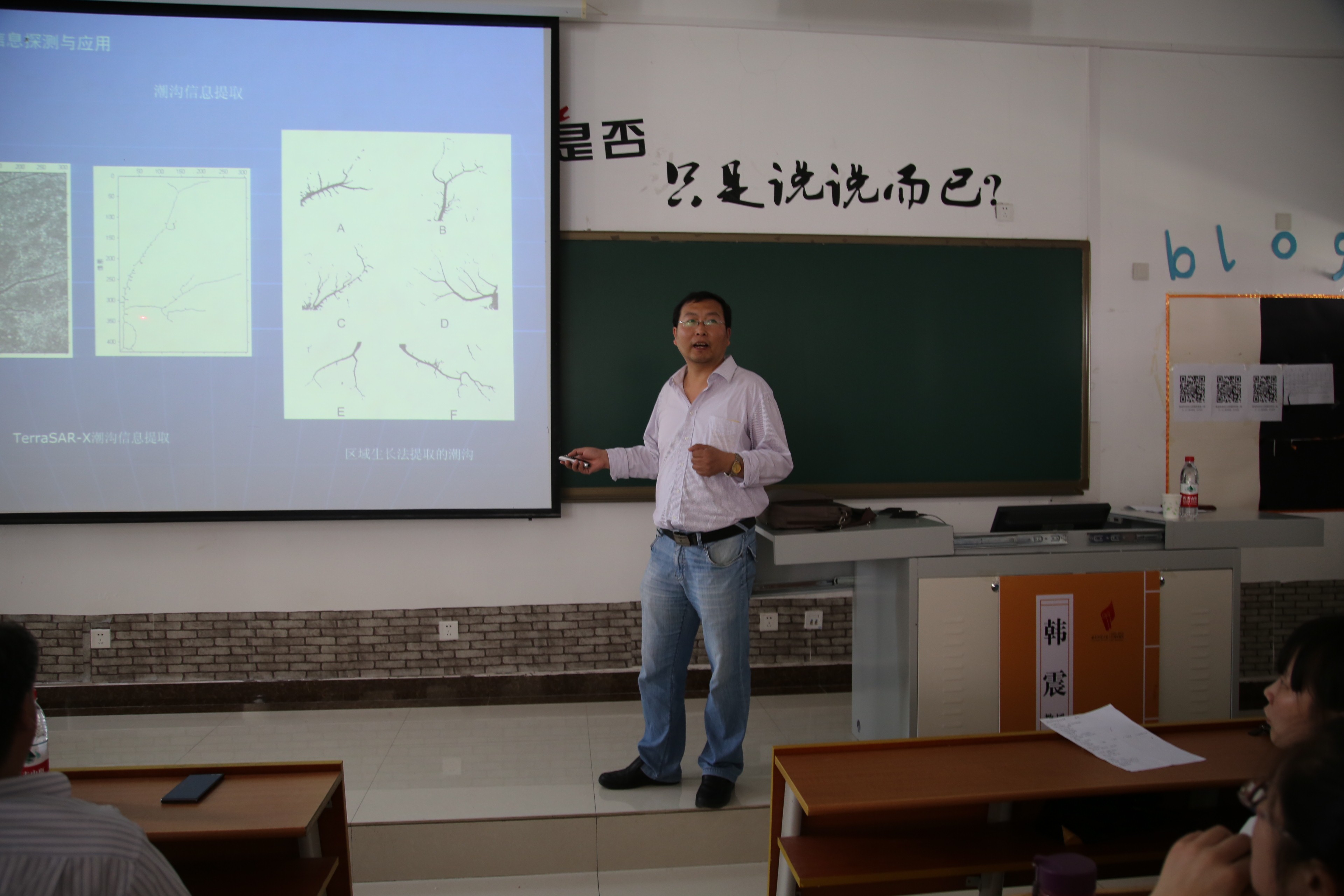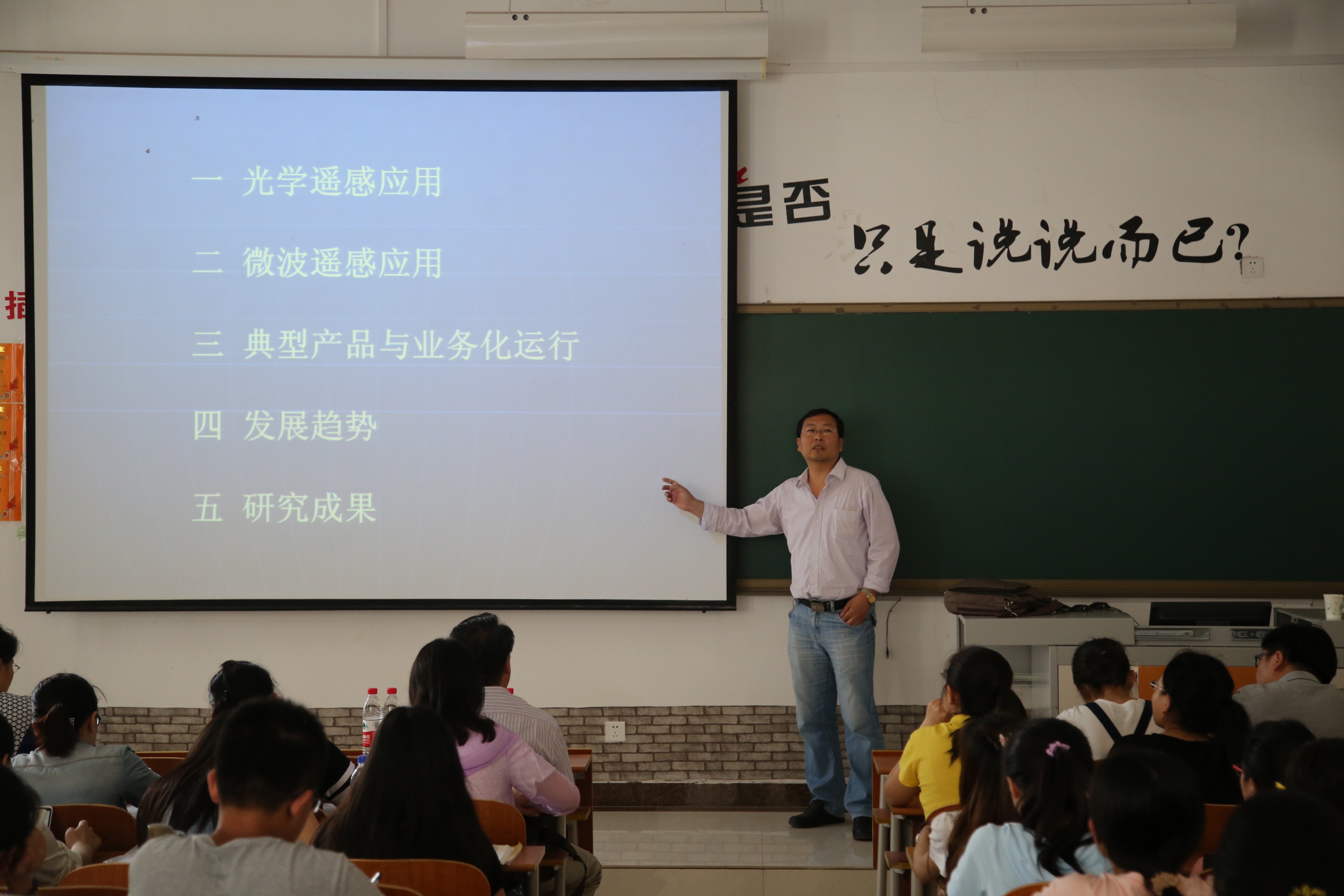 进行学术交流,并做了题为“海洋遥感信息探测与应用”的学术报告。韩震教授通过对光学遥感在赤潮和绿藻监测、海冰、海温、渔场环境监测及微波遥感在海面波浪场、风场、海洋内波、海洋污染、运动船只识别、河口及海岸带地貌演化的应用等方面对同学们进行了详细的介绍,并对有关的典型产品及业务化运行、海洋遥感的发展趋势进行了分析。在报告会中,与参会同学进行了互动交流,就同学们关心的问题及如何利用遥感数据进行科学研究进行了解答。