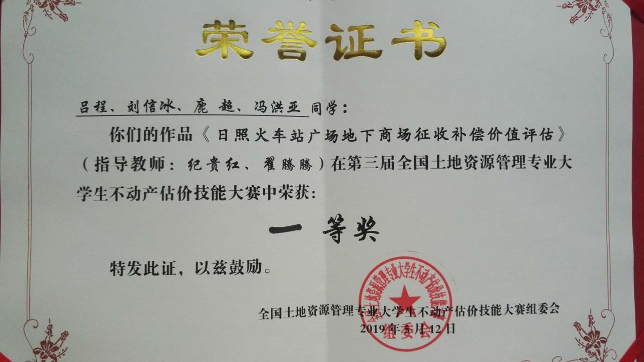 教师纪贵红、翟腾腾指导,本科生吕程、刘信冰、鹿超、冯洪亚团队的参赛作品“日照火车站地下商场征收评估报告”荣获一等奖。