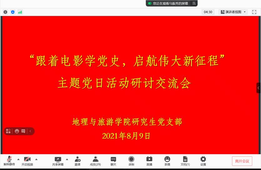 研究生党支部召开“跟着电影学党史,启航伟大新征程”线上主题党日活动研讨交流会。会议由研究生党支部组织委员马振秀主持,支部全体成员参加。