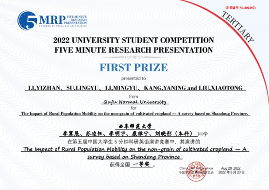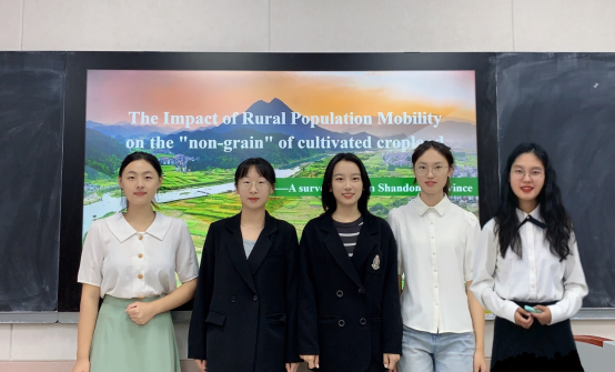 参赛的获奖作品“The Impact of Rural Population Mobility on the Non-grain of Cultivated Cropland——A survey based on Shandong Province”(乡村人口流动对耕地非粮化的影响——基于山东省的调查),在孙丕苓副教授指导下,基于2021-2022学年寒假社会实践收集的山东省7个地市174份农户调查数据,综合运用参与式农村评估法、空间自相关分析、地理探测器、格兰杰因果检验等方法,揭示农户视角下乡村人口流失、耕地“非粮化”的影响因素、发生机制以及乡村人口流失对耕地“非粮化”的影响,并从多角度尝试提出解决问题的对策与建议。