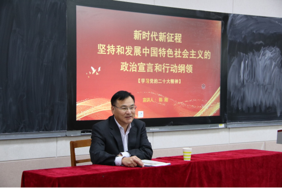 陈刚围绕党的二十大的战略定位、大会主题、过去5年的工作和新时代10年伟大变革的重大意义、习近平新时代中国特色社会主义思想的世界观和方法论、以中国是现代化推进中华民族伟大复兴使命任务、以伟大自我革命引领伟大社会革命的重要要求、团结奋斗的时代要求等七个方面,紧密联系学校教育教学工作实际,全面深入系统地解读了党的二十大报告所提出的新思想、新论断和作出的新部署新要求。