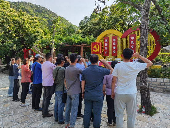 党委书记苏占兵带领大家面向党旗庄严宣誓。重温入党誓词,铿锵有力的誓言展现出全体党员不忘初心、牢记使命的信心和决心。随后大家走进沂蒙山小调纪念馆、大众日报社印刷厂纪念馆、抗大一分校文工团驻地旧址,以及沂蒙历史、沂蒙文化展馆,大家认真观看历史展板,详细听取沂蒙山人战斗历史和革命先辈英勇事迹,一段段详细的介绍让大家更深切体会到了沂蒙精神内涵。