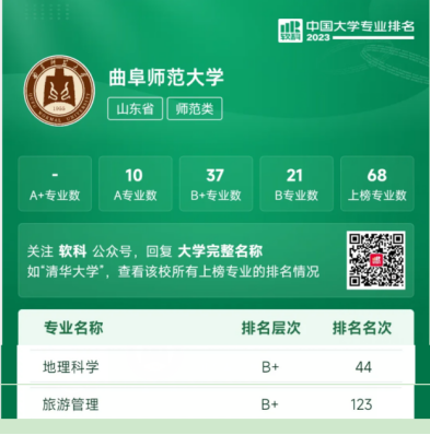地理科学、旅游管理两个专业上榜,并双获“B+”评级。