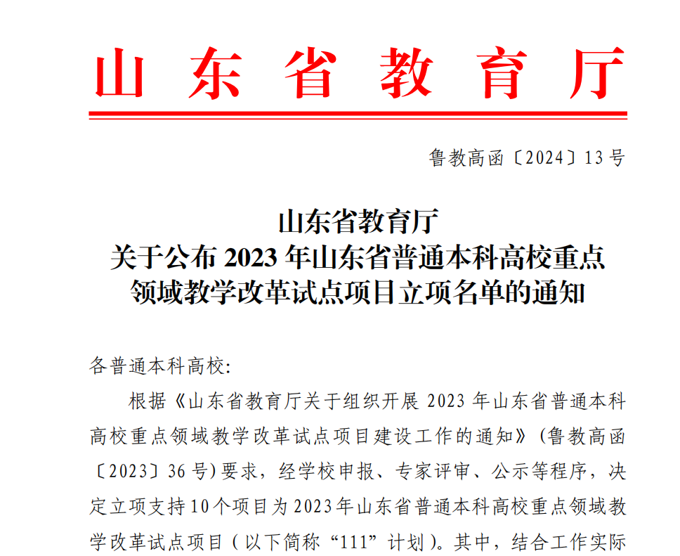 日前,山东省教育厅公布了2023年山东省普通本科高校重点领域教学改革试点项目(简称“111计划”)立项名单(鲁教高函〔2024〕13号),全省共10项。