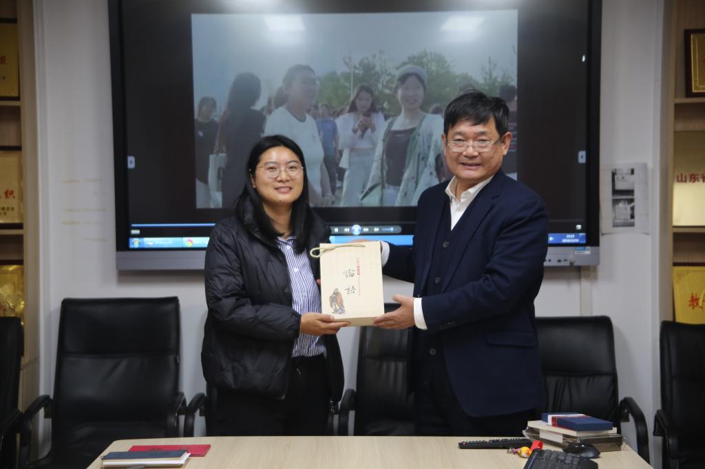 党委书记苏占兵为公惟莹颁发了曲阜师范大学国内访学结业证书,院长张全景为其赠送曲园文创纪念品,表达了对其工作的肯定和对未来的美好祝愿。座谈会现场播放了公惟莹老师入校访学期间的工作微视频,共同回顾了一起工作学习的难忘瞬间。穿梭于曲园的教室与宿舍,定格在一场场会议研讨中专注的目光、烈日下军训场上的青春飞扬、深入学生宿舍园区看望学生的温馨瞬间……,一个学期访学历程如电影般回映,引得大家感动和难忘。