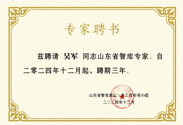 近期,经同行专家推荐,学校同意,经山东省智库高端人才工作专项小组审核批准,吴军教授被聘为山东省智库专家,并担任黄河战略核心团队成员。吴军教授现为博士生导师、女足直播