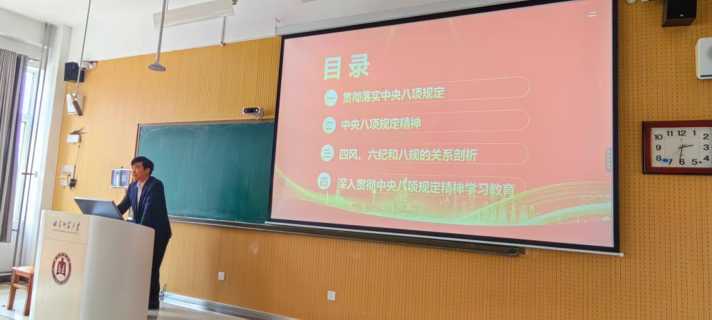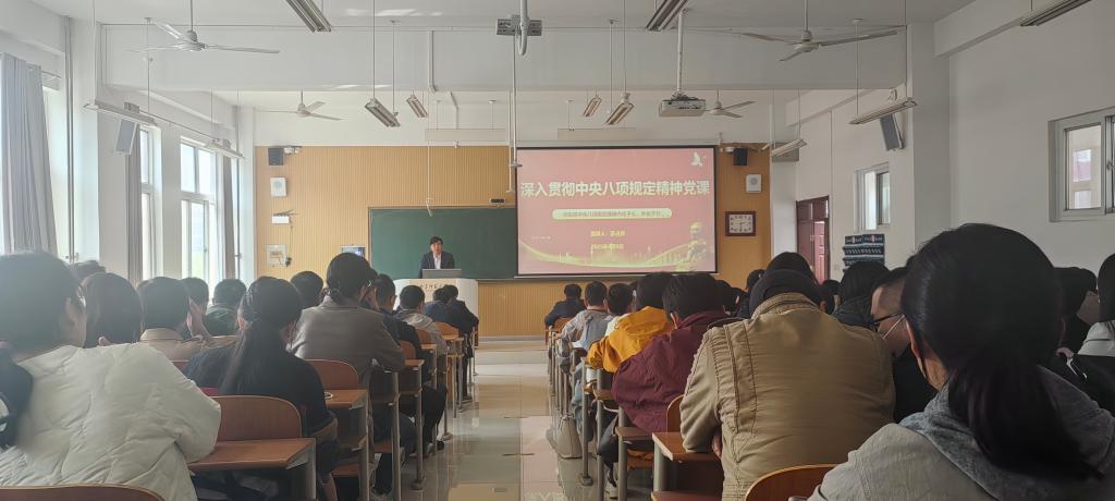 在S楼314教室召开政治理论学习会议,全体教工参加学习。党委书记苏占兵以“切实将中央八项规定精神内化于心、外化于行”为主题,为全体教工讲授了一堂深刻而生动的党课。