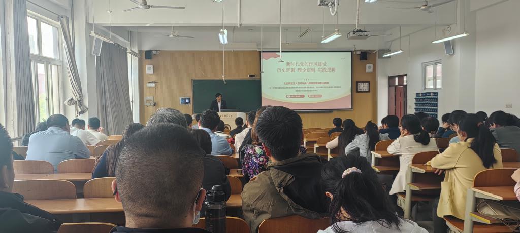 党委书记苏占兵在S314教室以《新时代党的作风建设的历史逻辑、理论逻辑和实践逻辑》为题,为全体教师呈现了一堂深刻的党课。