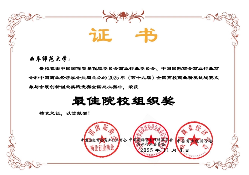 11月21-24日,2025年(第十九届)全国高校商业精英挑战赛文旅与会展创新创业实践竞赛全国总决赛精英赛在浙江永康举行,曲园学子凭借出色的项目创意与现场表现,斩获旅游新业态项目策划赛道一等奖1项、三等奖1项,并获得2026年(新加坡)国际商务会展策划大赛参赛资格,田青、张瑜获最佳指导教师奖,学校获最佳院校组织奖。