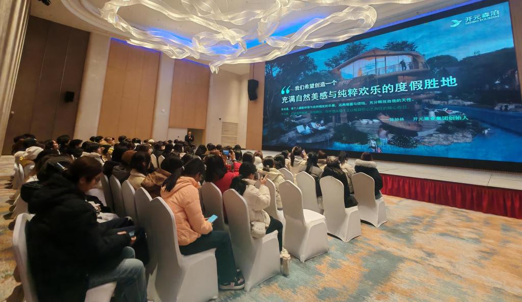 活动伊始,开元森泊度假乐园人力资源总监、培训经理、市场收益部经理等企业高层管理人员热情接待了师生团队。市场收益部张志来经理以“开元森泊品牌及IP创新之路”为题,为同学们进行了专题分享。他从中国度假市场发展趋势切入,深入剖析了开元森泊如何通过“自然生态+度假体验+IP赋能”的创新模式,在竞争激烈的旅游市场中构建独特品牌优势。讲解中提到的“沉浸式度假体验设计”“IP产业链延伸”等前沿概念,让刚刚步入专业学习的新生们对现代旅游业的创新维度有了直观认知。