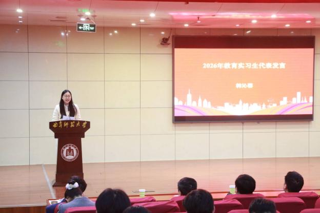 指导教师代表孙丕苓表示,希望同学们怀揣对教育事业的敬畏之心,秉持严谨敬业的态度,在教学全流程中积累实践经验,通过持续反思打磨教学技能。实习生代表韩沁馨承诺,将严守实习规章制度,虚心求教、积极投身实践,不辜负学校与老师们的期望。